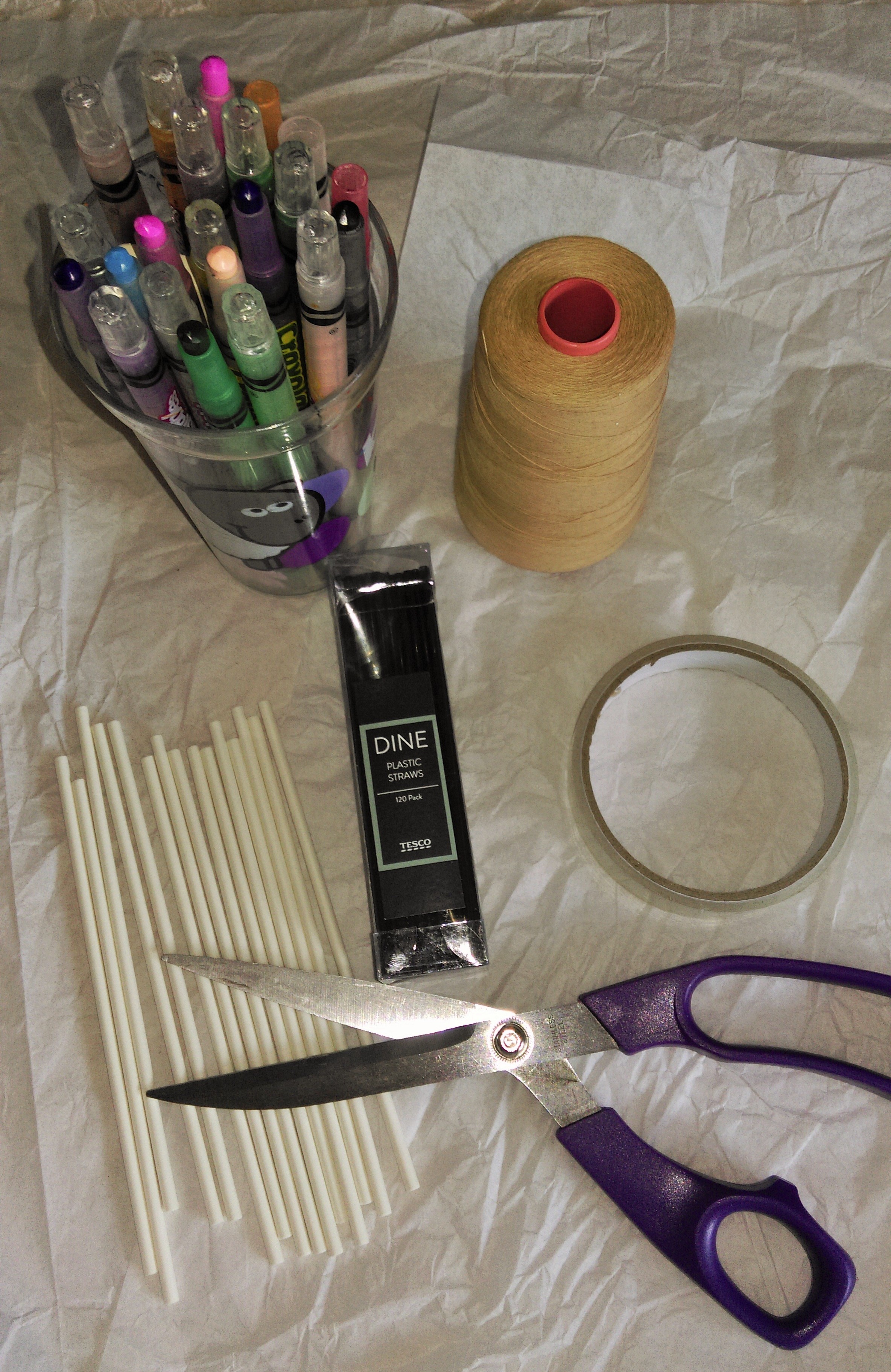 So, after a quick rummage around the house for things we could use to make ‘mini-kites’ we found tissue paper, thread, sellotape, coloured pens, tiny straws, cake pop sticks and colouring pencils.