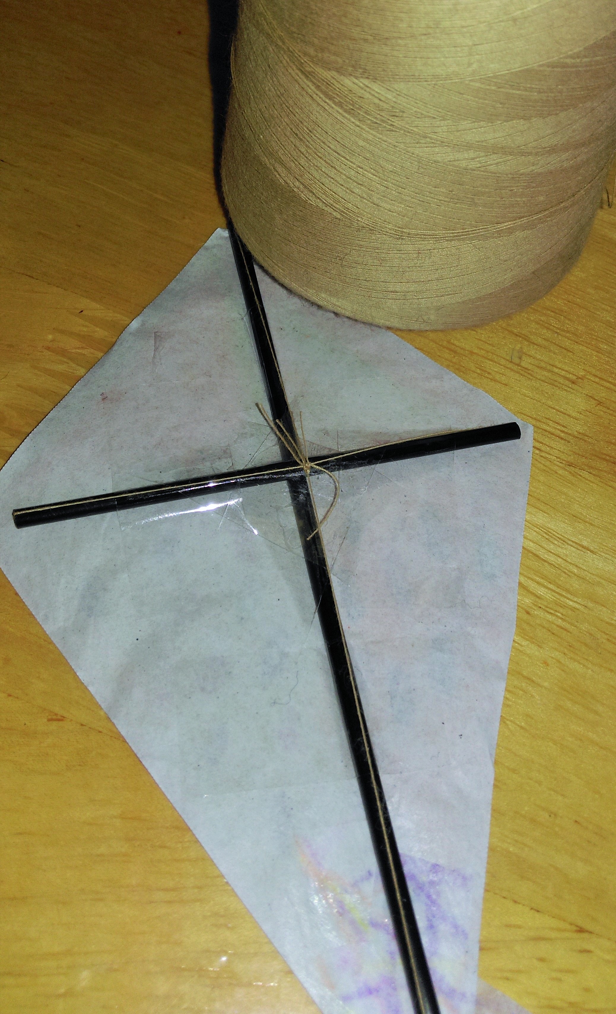 Now for the tricky part… attach the little straws using some tape (easy enough). Then feed two separate lengths of thread through the straws, tying at the ‘crossroads’.