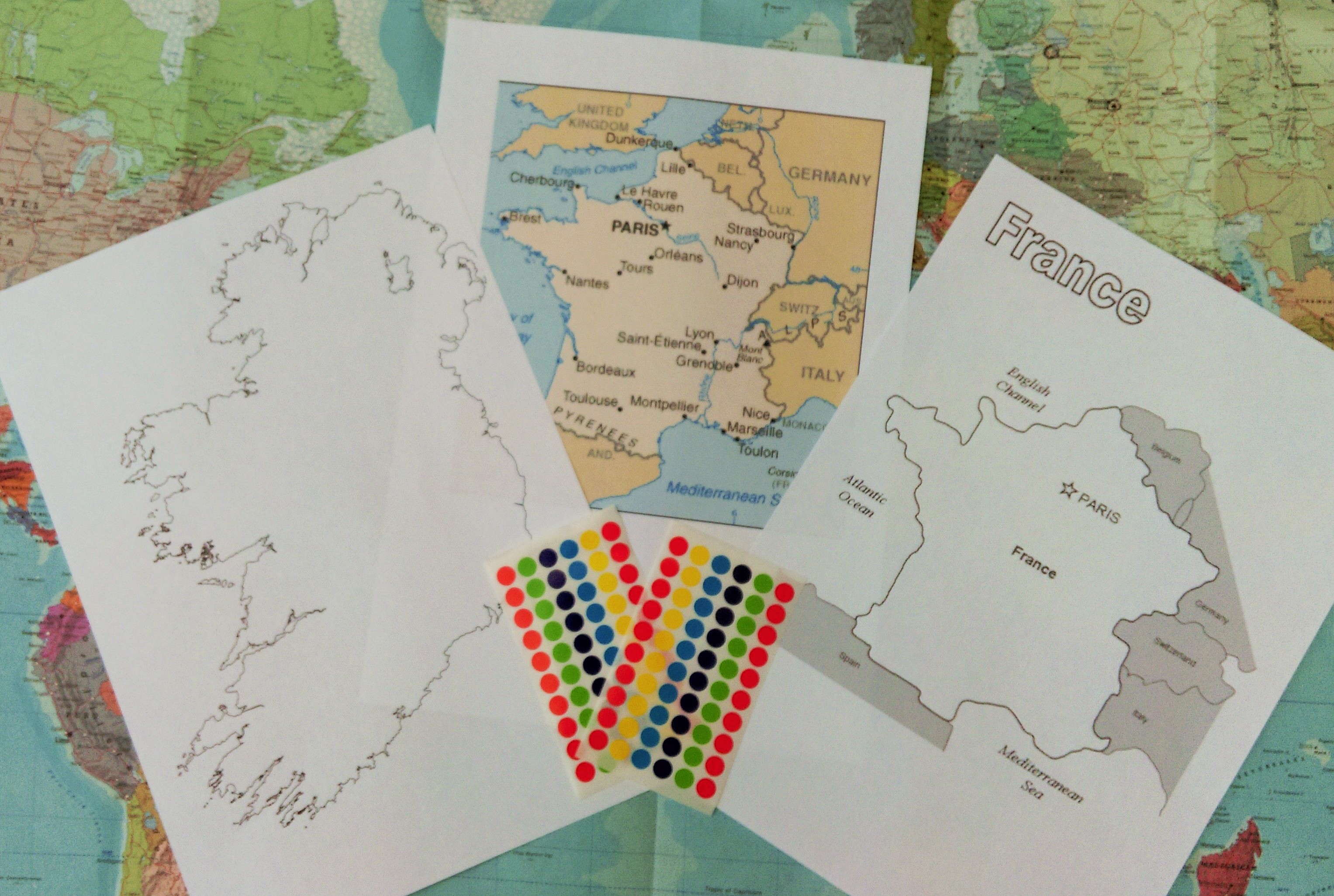 We are travelling from Ireland to France, so we have a 5 hour car drive, followed by an 18.5 hour ferry journey, then another 5 hour drive once we arrive in France, so we printed maps of Ireland and France and the kids can even use their coloured dots to chart our route across the sea! It’s not an activity that will last for hours, but surely they will benefit from learning some map skills?