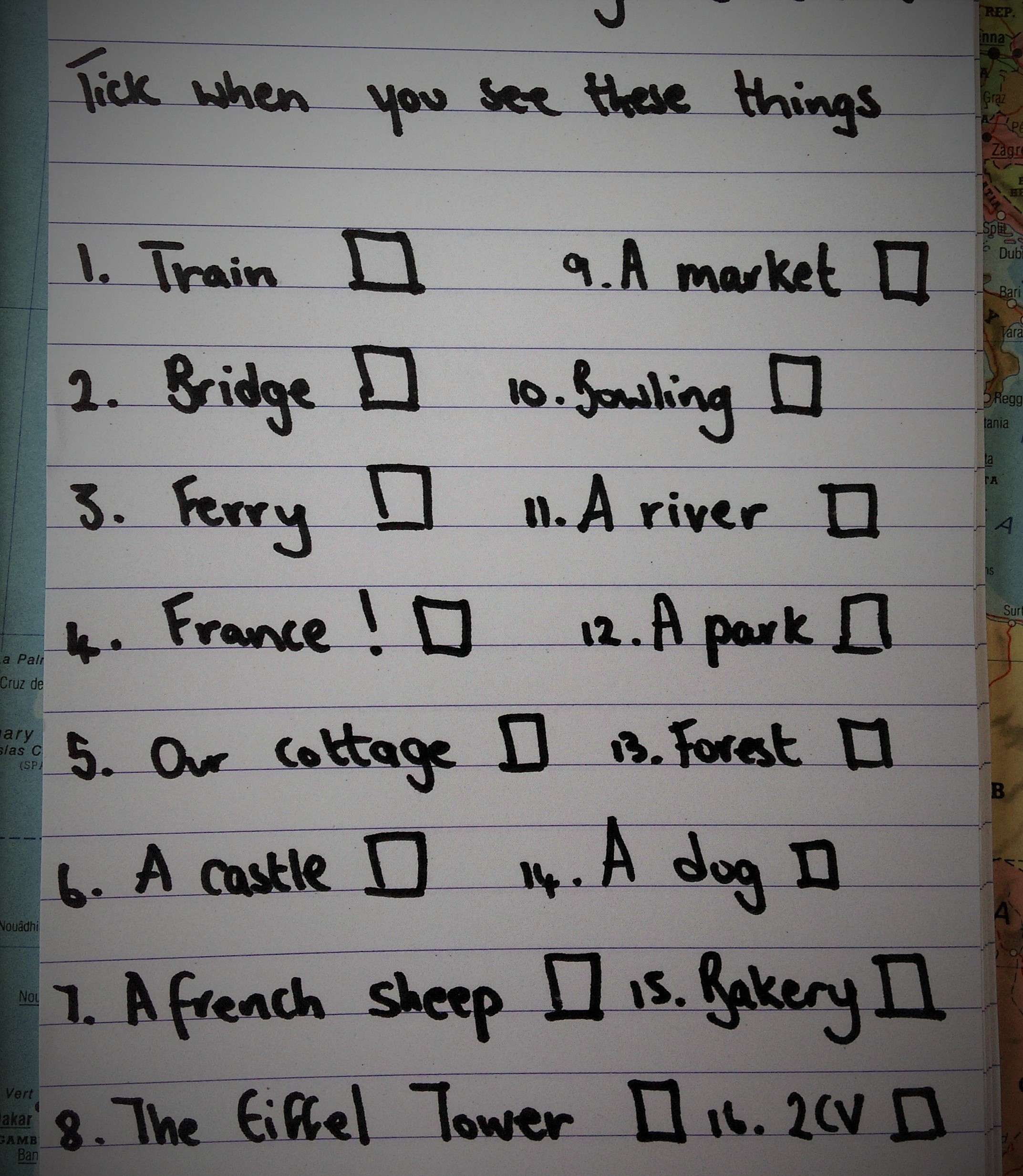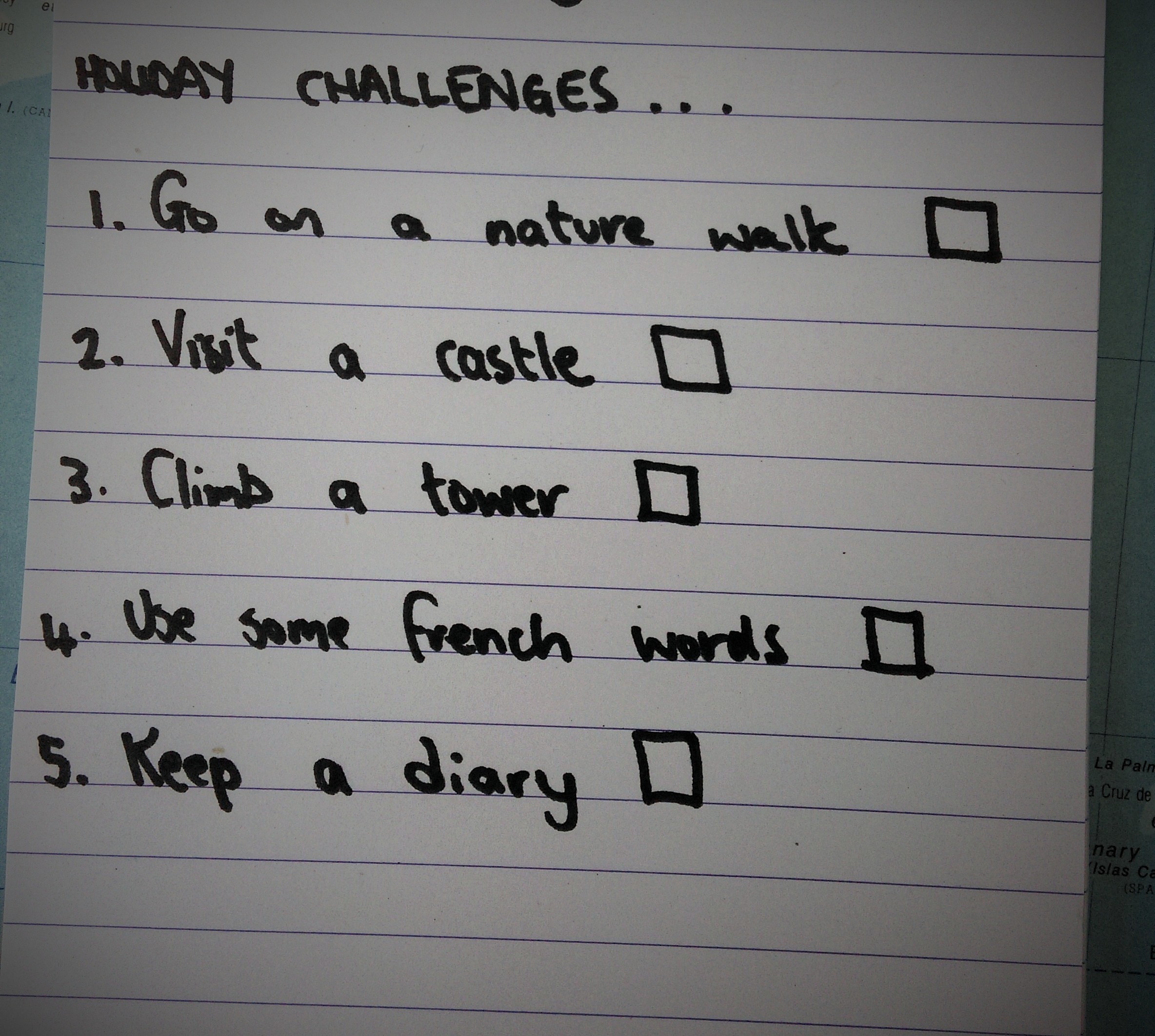 For my second child I have listed a few challenges for him to tick off during our holiday. Most of the suggestions are for things while we are away but the 5th one listed is ‘Keep a diary’ and I know that he will want to begin this as soon as we leave the house. He loves to write things down in detail and draw pictures so this suits his personality – he will have a great journal of our French holiday plus he will have worked on his spelling and writing skills too – win, win!