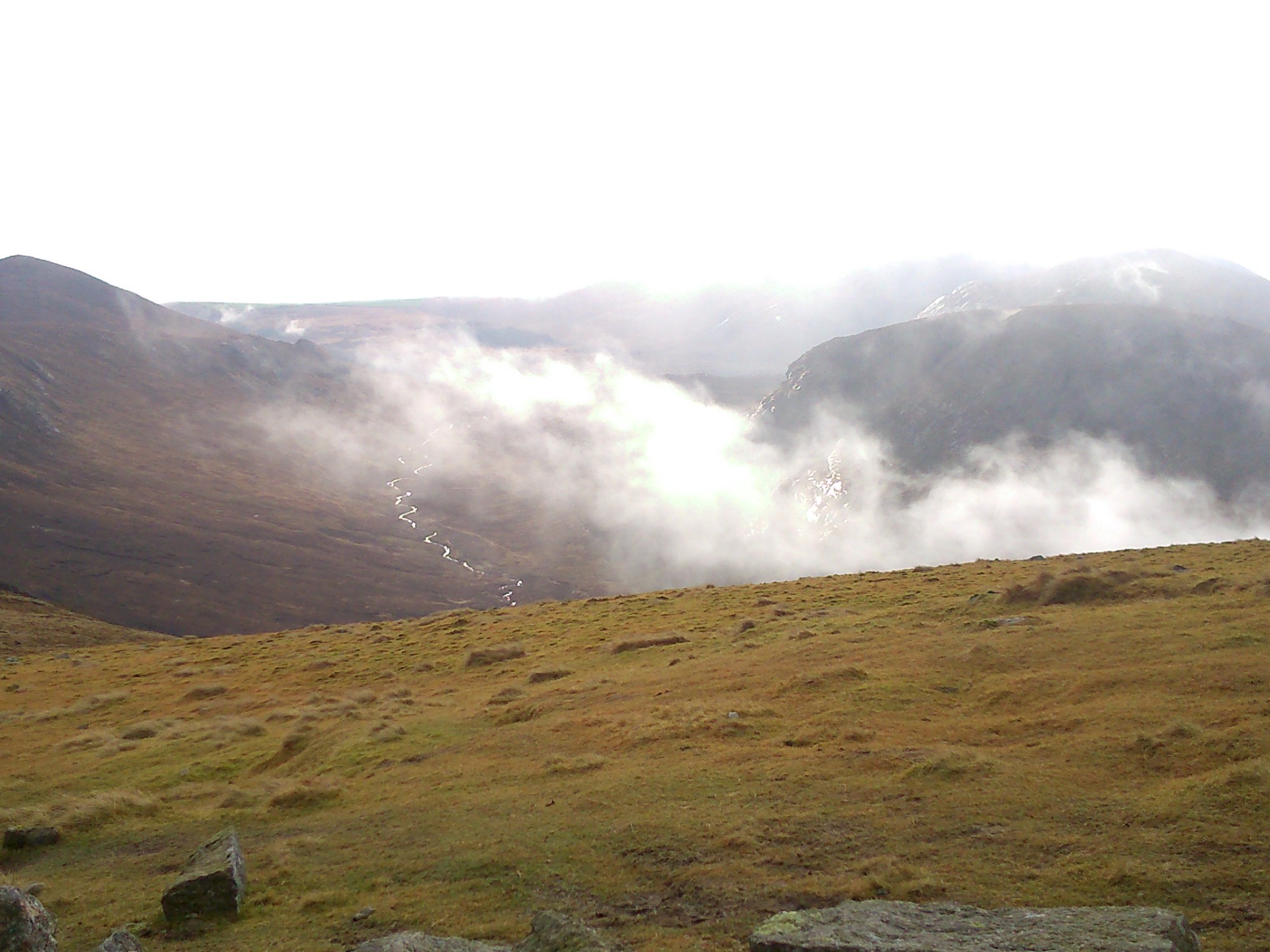 Once the laces were tied and layers put on we were ready. We had decided to tackle Slieve Commedagh, the second highest mountain in the Mournes. It has a well-worn trail and isn’t too soggy during the winter months. The fog was low though and visibility was slightly obscured. Undeterred, we took off, working our way up alongside the Glen River at a brisk pace, stopping for lunch at the saddle (the gap between Slieve Commedagh and Slieve Donard).