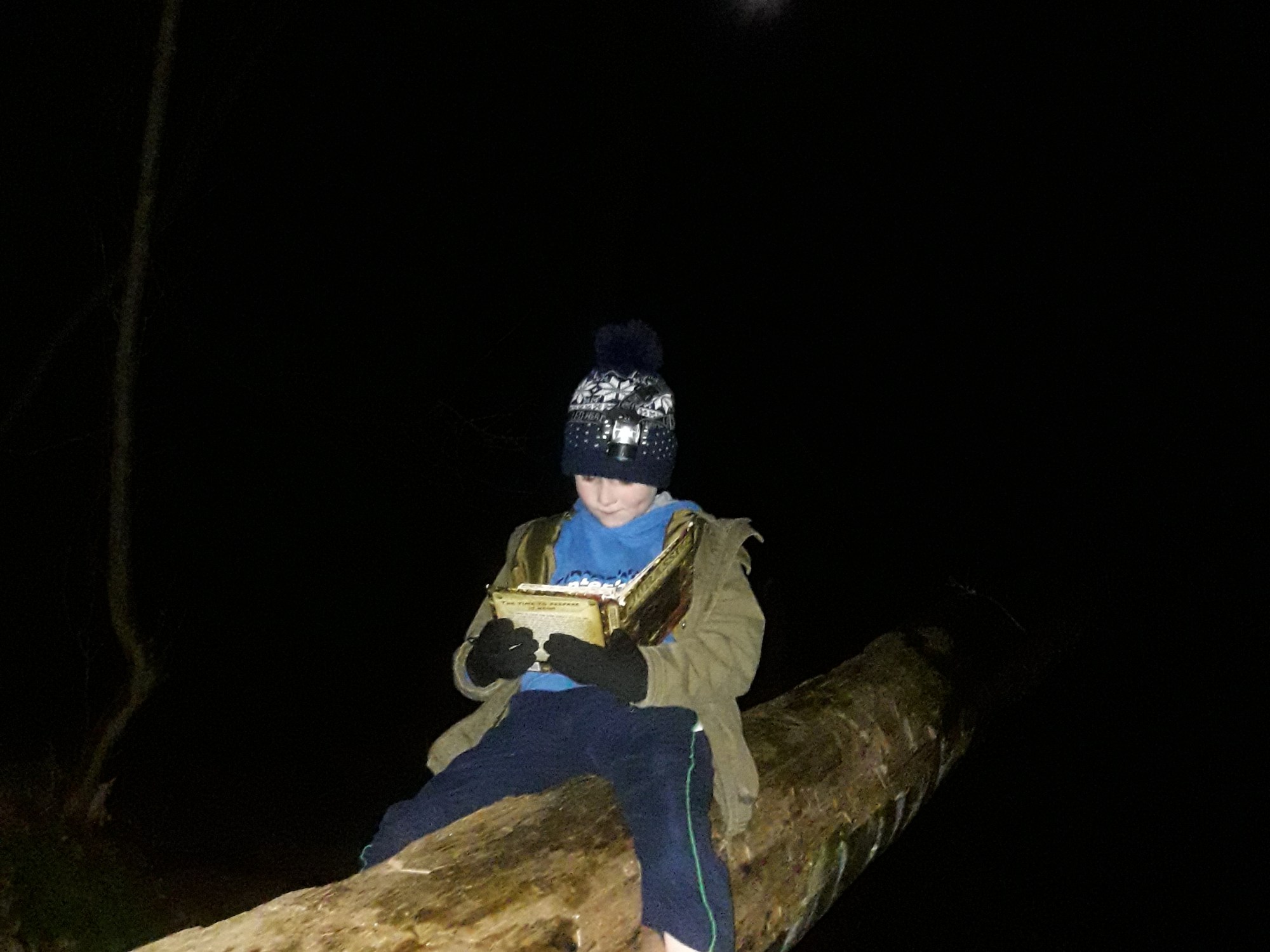 We found a fallen tree trunk for the boys to stop and read their own books and take a few snapshots for their ‘extreme reading challenge’ at school. Afterwards we continued onwards until we came to a gate in the Lisnabreeny Hills that opens into a field which is open to the public and offers the best views over Belfast. The city lights far below were shining brightly and the sky overhead was filled with stars twinkling clearly. We stood in the silence and tried to pick out buildings and constellations before beginning our downward trek. Despite it being February, it wasn’t at all cold, it was still and peaceful and a perfect way to spend an evening together.