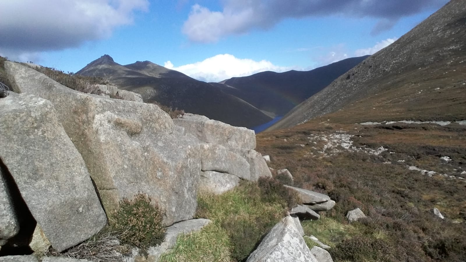 We ate quickly and set off again as the winds continued to pick up force. Admittedly, I was at this point a little anxious that we weren’t well enough prepared for what the summit of Binnian held on such a blustery day! Our previous hike had been just a month ago and we had been in t-shirts and shorts then and had even enjoyed a dip in a river. Even with our layers and hats and scarves, I was worried we were going to freeze atop the mountain due to the wind-chill factor. We rallied together to make a decision and chose to continue onwards and upwards, eager for the views we knew were waiting for us. As we ascended towards Buzzard’s Roost a slight rain shower resulted in a rainbow dipping down into Ben Crom Reservoir, causing us to pause and stand in awe of the surrounding scenery. How lucky to live in such a spectacular place!