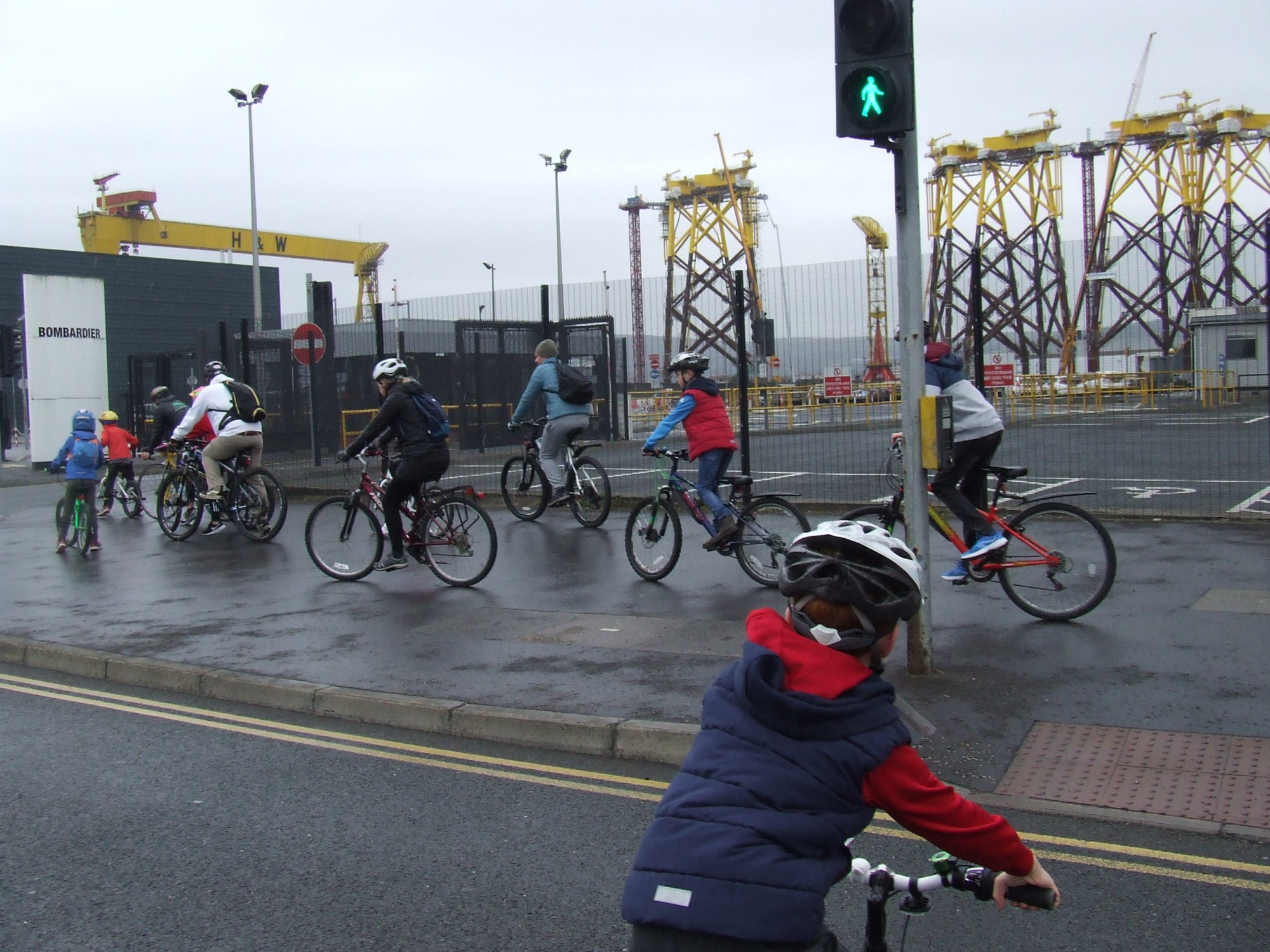 With everyone eager to get moving and stay warm we enthusiastically set off at a gentle pace to accommodate everyone. Our group consisted of several families, with the littlest ones taking up the best seats in the house on the back of Mum or Dad’s bike, toddlers pedalling all on their own – their little legs working at twice the speed of everyone else’s, all the way up to teenagers. Everyone chatted as we cycled towards Victoria Park and across the Sam Thompson Bridge, the view of the world-famous Harland and Wolff cranes strikingly yellow against the dreary backdrop of the sky.