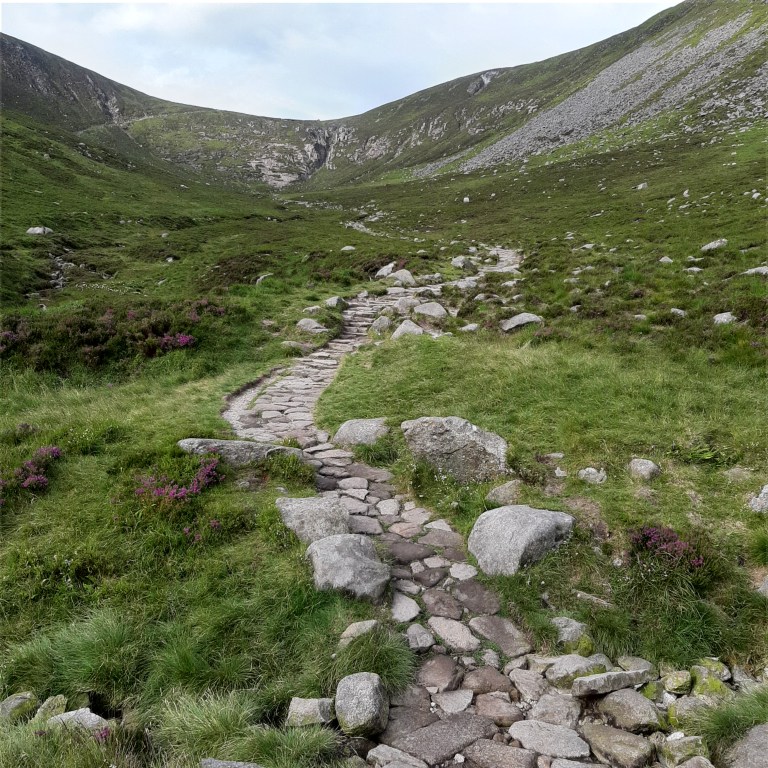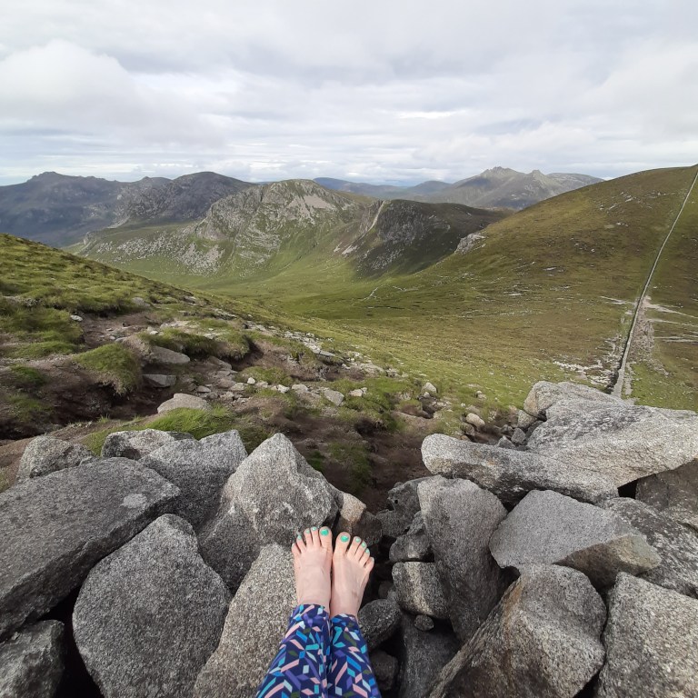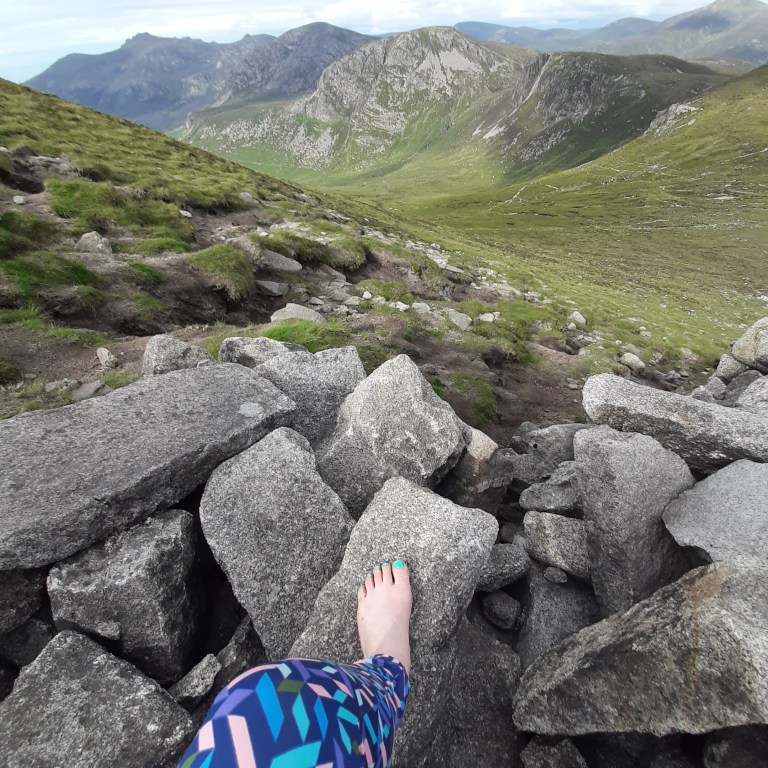 I had thankfully packed my rucksack light, with only a few snacks and water, because before long the air turned much warmer and humid and I needed to discard the many layers I had piled on in anticipation of rain and wind. Suddenly, there I was, treading up the lower levels of Slieve Donard wearing only a t-shirt and leggings…I felt so wild and free and heard myself laugh into the quiet as I realised that I was actually enjoying myself. I told myself I was at least giving it a good go if nothing else! It was a glorious morning to have the mountainside to myself and I made sure to halt every few minutes to take in the views as the world awakened to a whole new day of opportunity. Suddenly, it felt possible that I could actually do it. I looked upwards at the path that lay ahead and marched onwards as fast as my bare feet would allow!