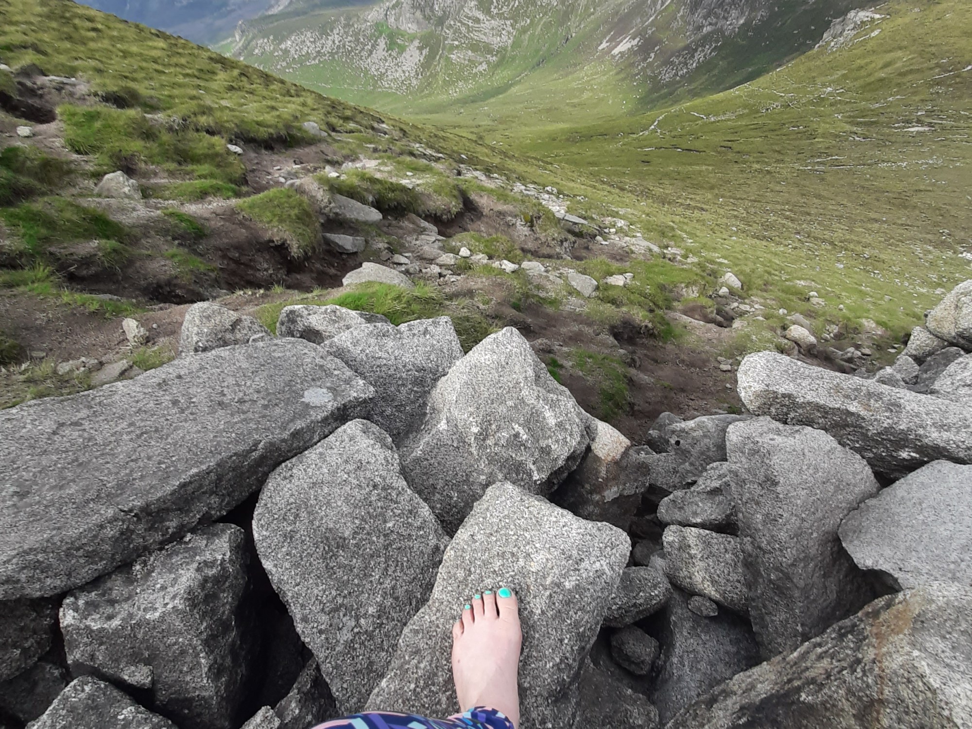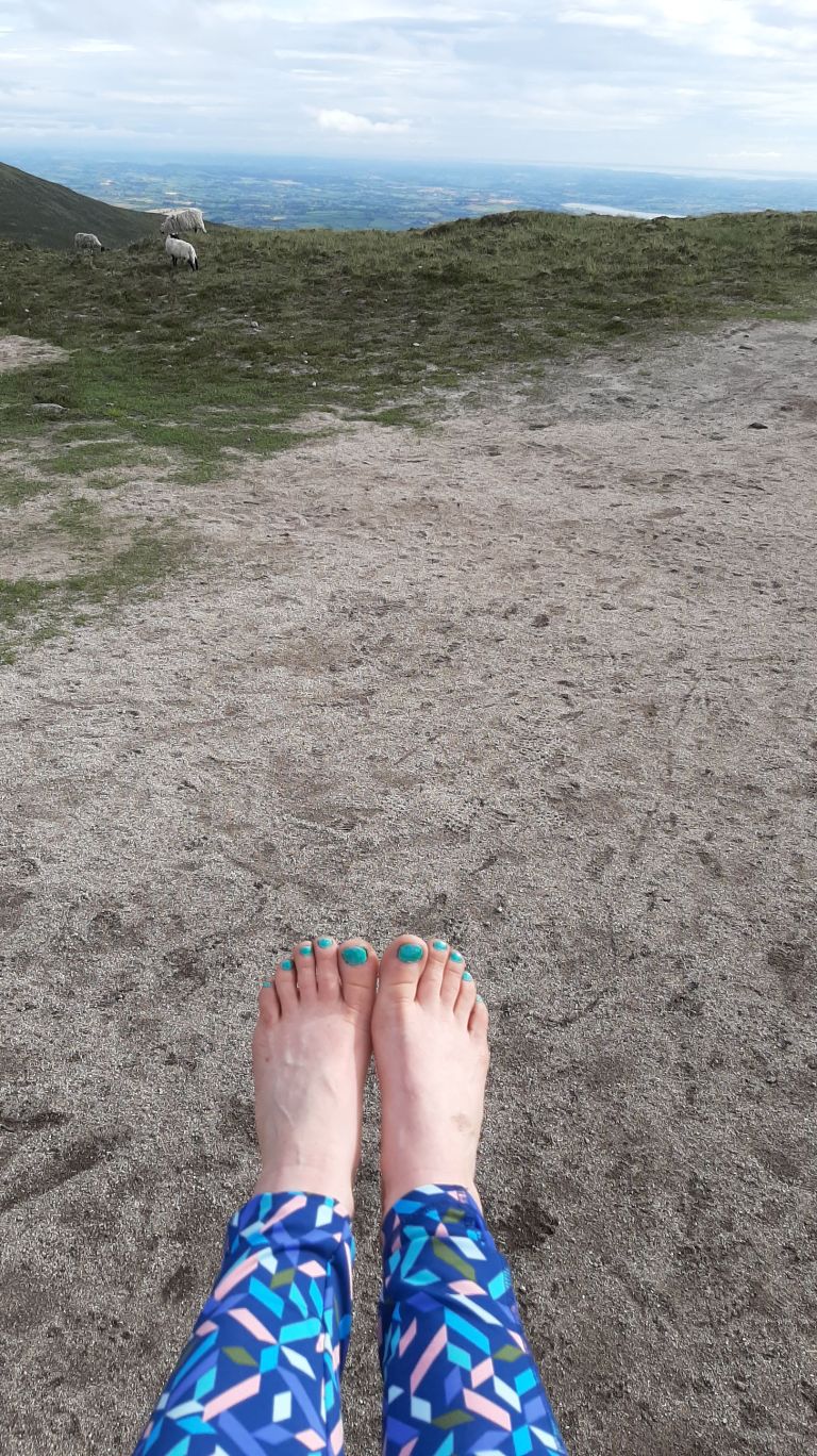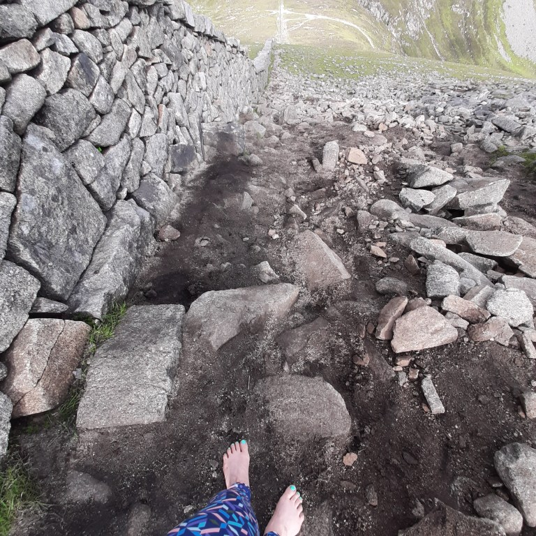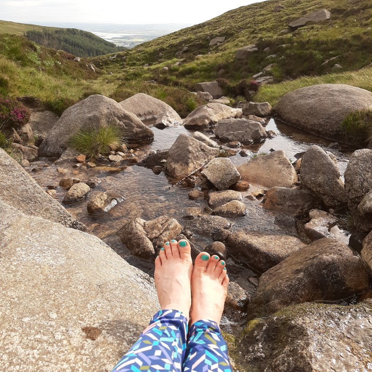 For several minutes I sat in the sunshine, and for those few moments in time, I was physically the highest person in the country and my sense of accomplishment was soaring too! I had been dreaming about this challenge for quite some time, and although a few people had mentioned that I was potentially insane when I’d mentioned it, I had done it and I was so pleased and also so completely calm as I sat atop Slieve Donard enjoying the spectacular vista. There are times in life when you just feel you’re in the right place at the right time and that for me was definitely one of those occasions – all was well with the world! A few snapshots later and I began my descent…at first slowly, knowing that often my knees don’t always appreciate the downward climb (old age!) but soon I noticed I was actually jogging downhill, the surge of adrenaline from having managed to complete the climb to the summit barefoot pushing me onwards. I was no longer paying as much attention to where I was laying my feet, it was all happening naturally, I felt grounded, at one with myself on the mountainside and connected with the earth. Soon, I realised tears were streaming down my face. I was overwhelmed by emotion and halted to look around me and analyse my thoughts for a moment or two.