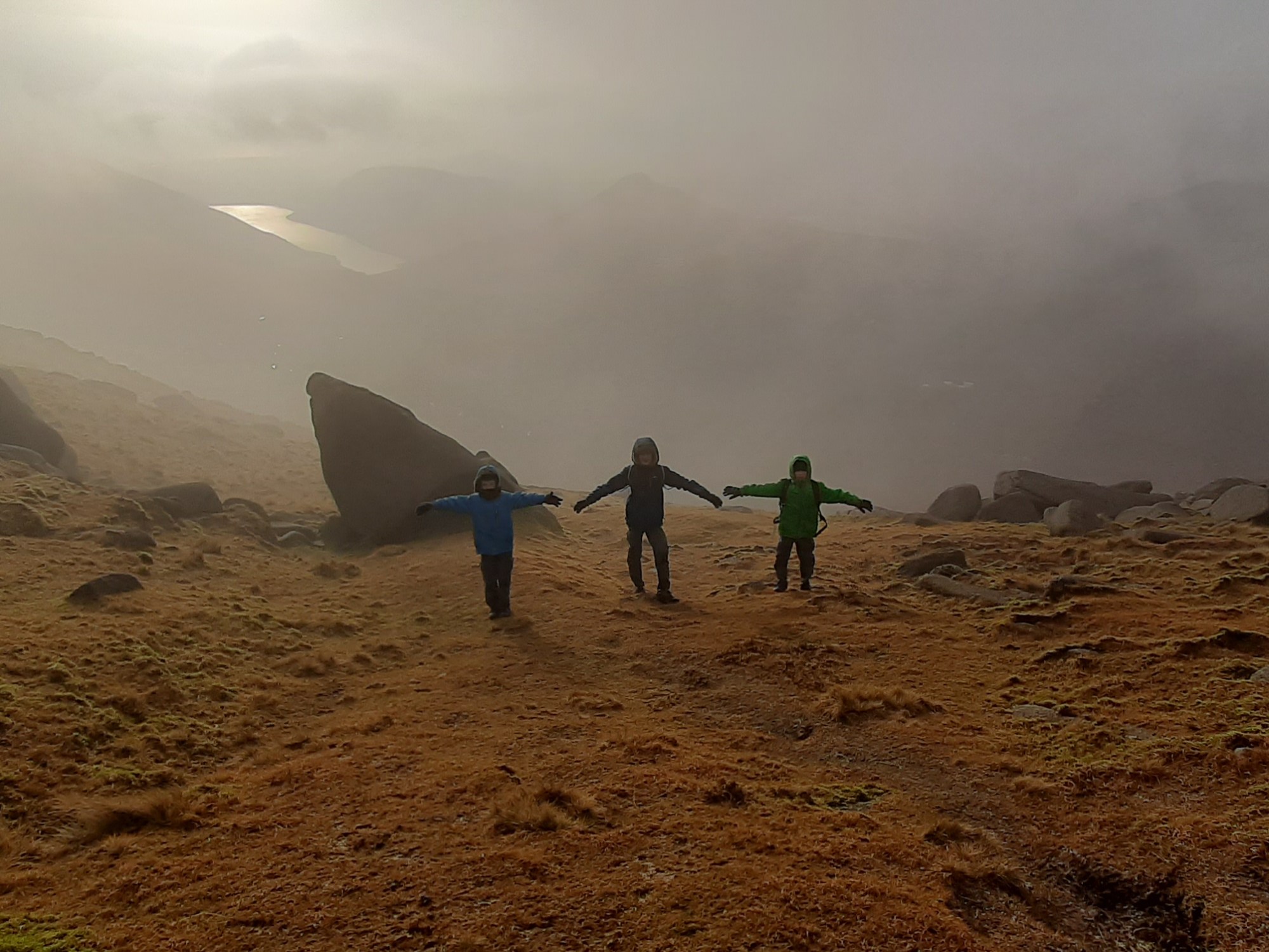 While the temperature wasn’t as bitterly cold as we had anticipated and prepared for with our many layers and waterproofs, it was fairly windy and the cloud hung low for most of the day. The views weren’t clear or far-stretching, but there was a mysterious beauty nonetheless, and we didn’t encounter any other hikers all day, so that always lends to a sense of being truly immersed in the wild. My 3 boys love role-play while hiking, often taking on the personas of their heroes, Steve Backshall and David Attenborough and so forth!