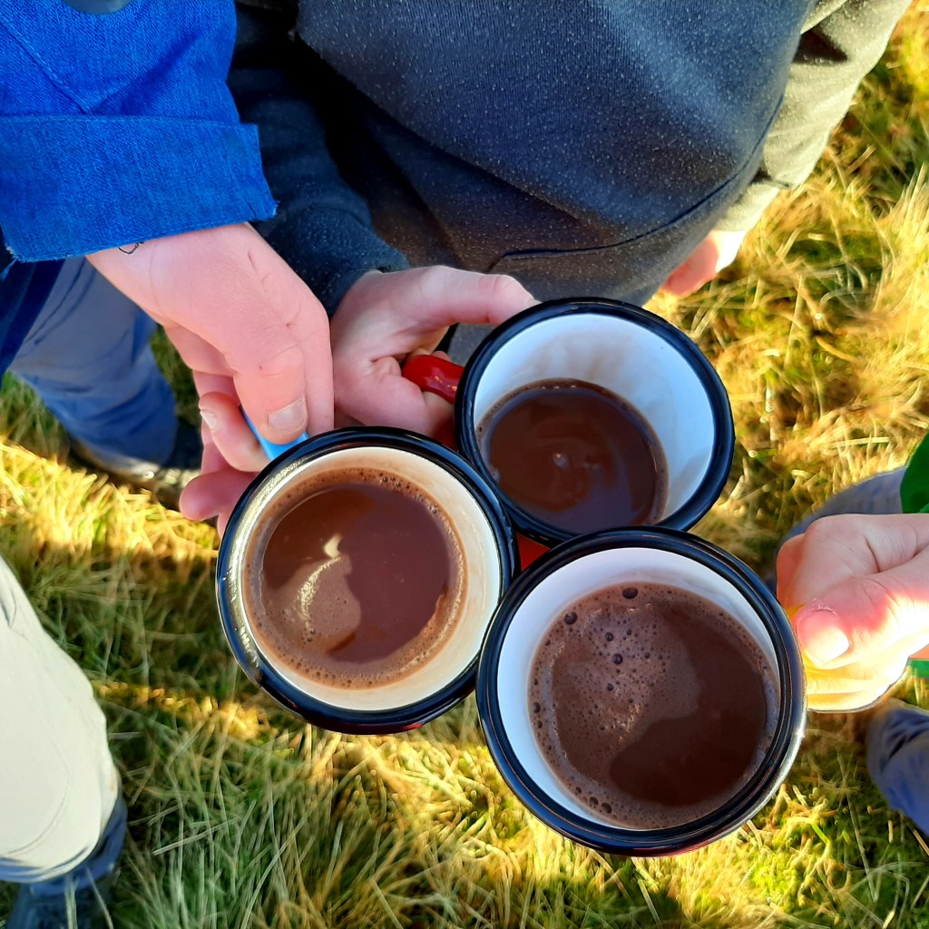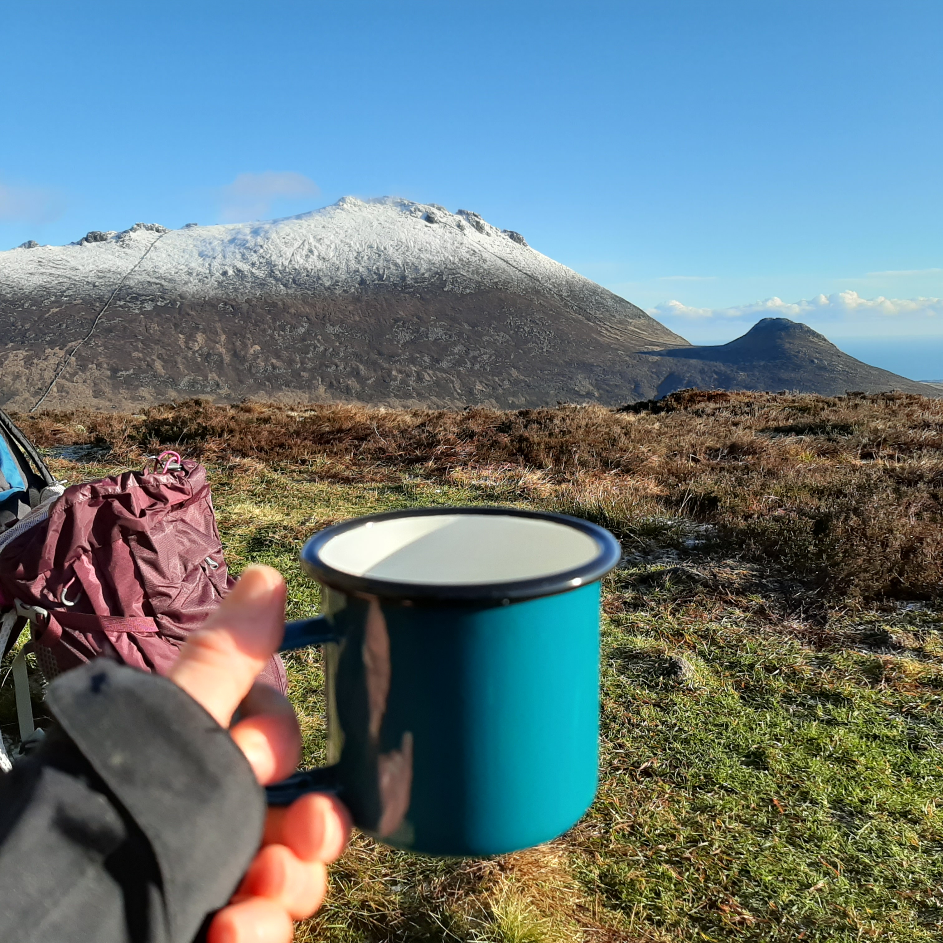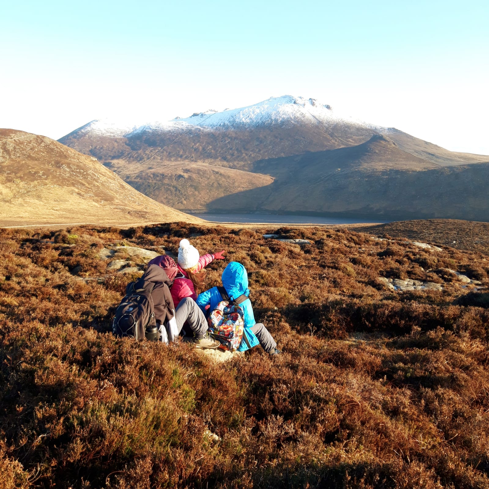 We took our time and thankfully due to the lack of wind were able to really take in the beautiful views across to the higher snow-capped peaks rather than have to hurry to stay warm. We found a glorious little sweet spot alongside the mountain wall, leaning back on the granite blocks while facing the sun and looking out across the glistening Irish sea beyond and here we paused for lunch. The weather was so mild that we were able to linger and brew fresh coffee while the 3 children ‘ice-skated’ on the frozen puddles; their shrieks and laughter making us smile while we savoured our hot drink and closed our eyes for a few moments of pure mountain bliss!