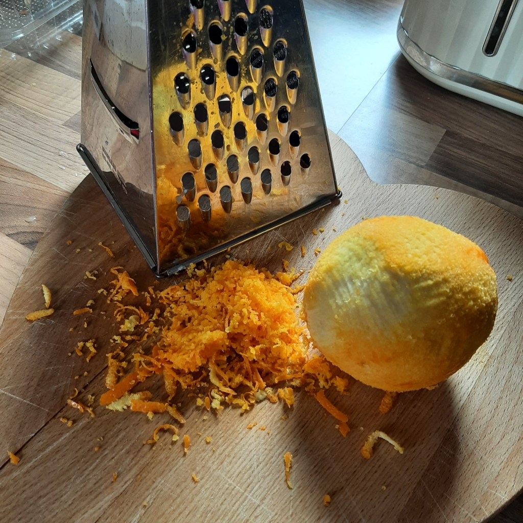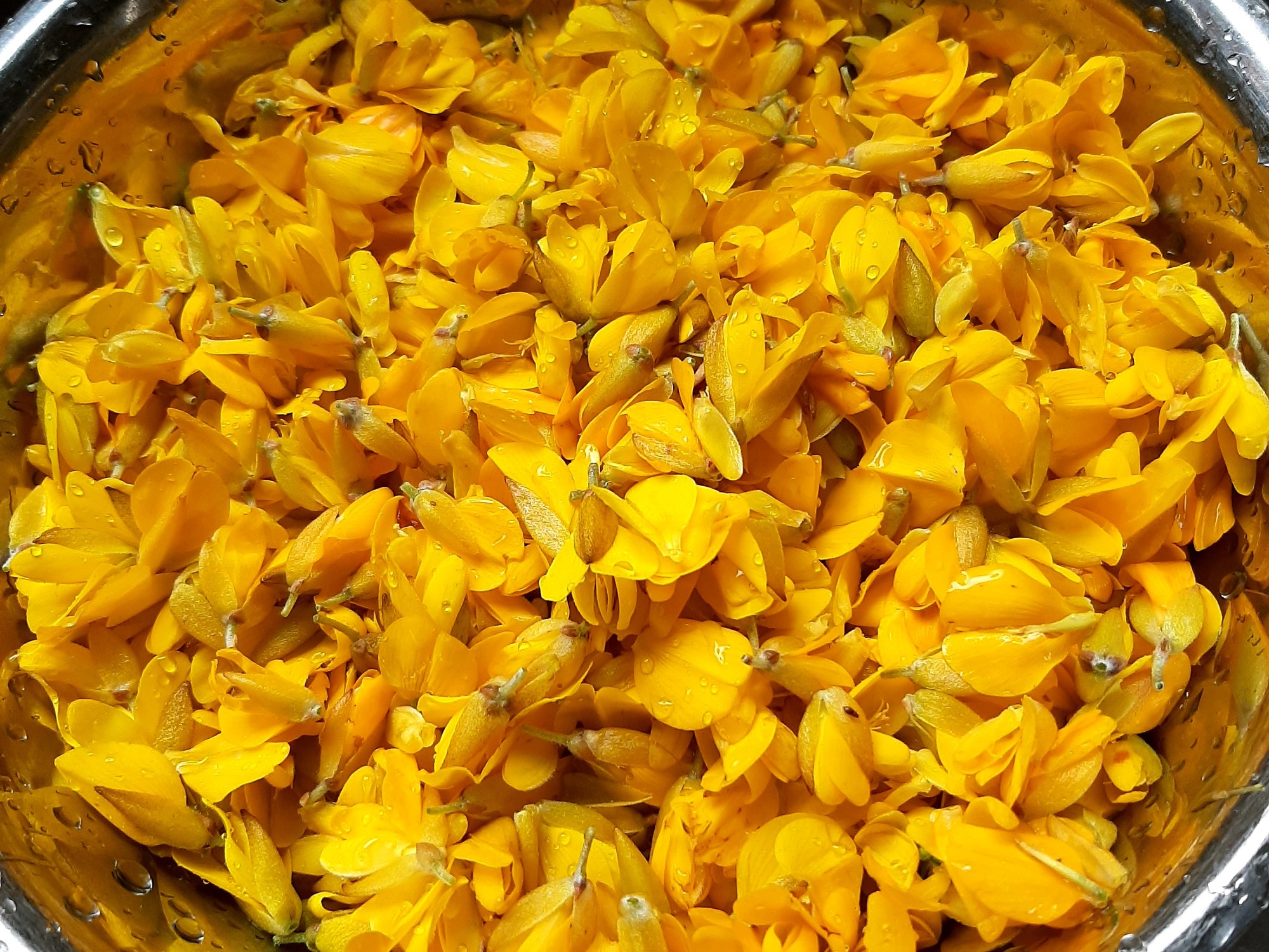 2. Remove from heat and add the gorse flowers, orange zest and lemon juice and stir