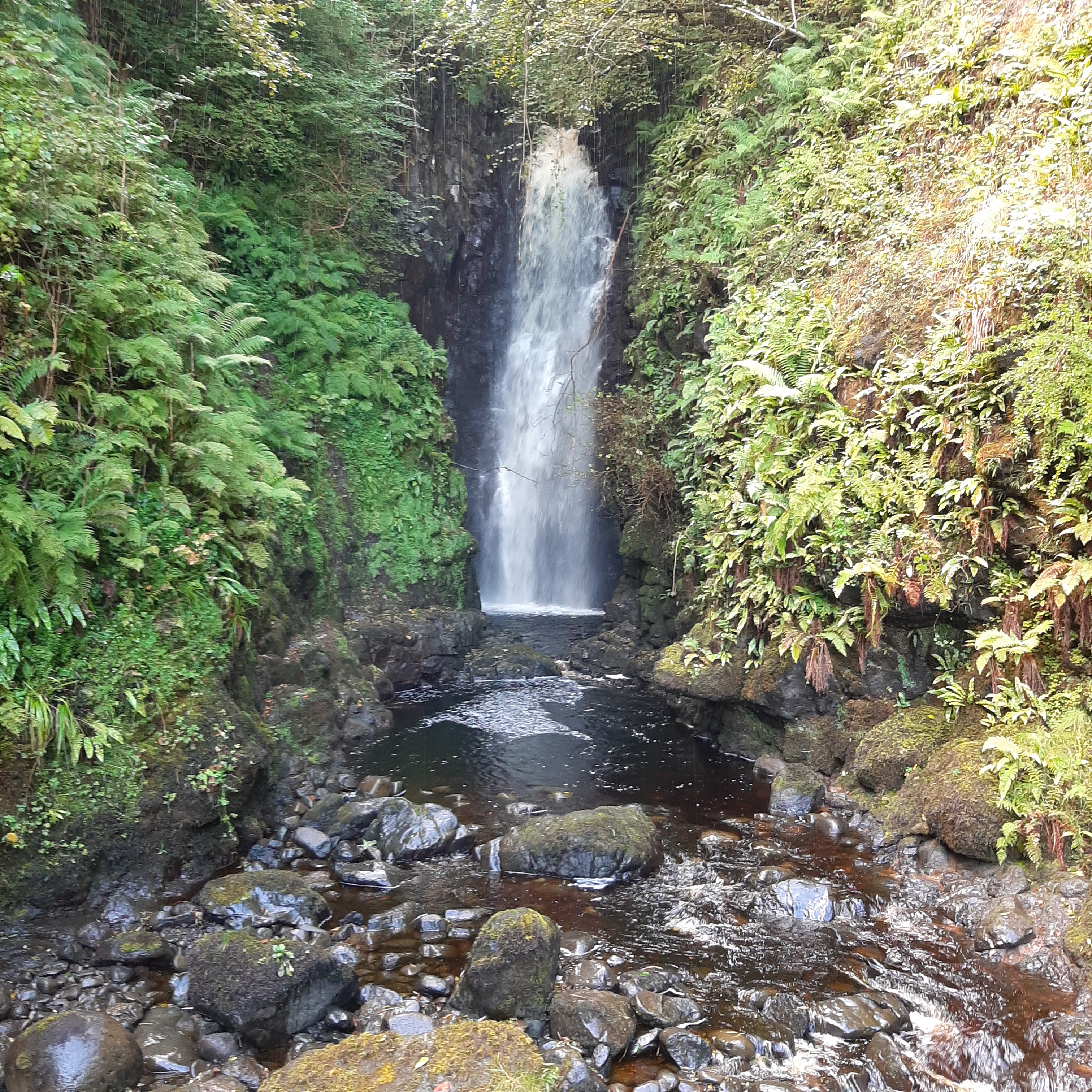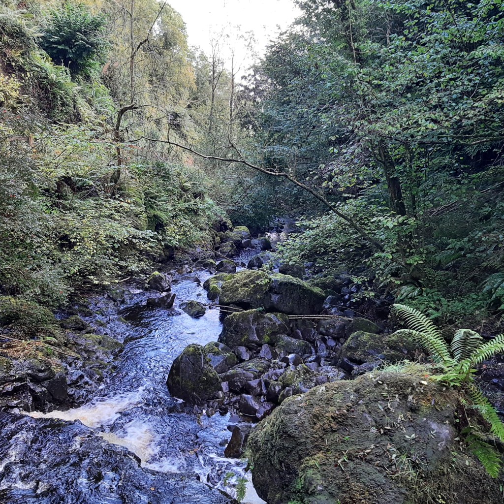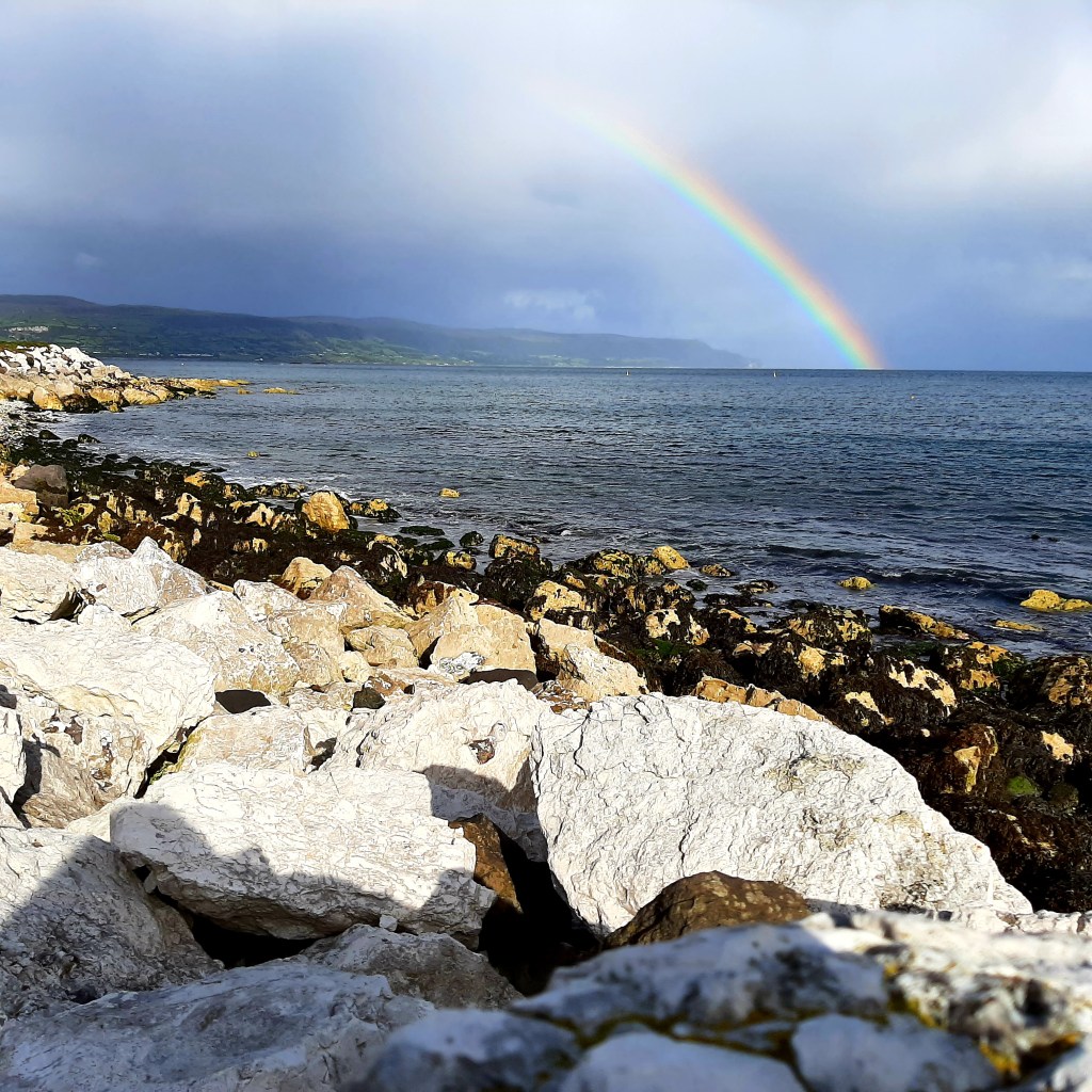 Towards the close of the month I drive north from Belfast around the coast road. A rainbow arches from the Glens of Antrim across to the sea as I arrive into the harbour village of Carnlough on the Causeway Coast. A welcoming sight to behold just before the skies unleash an impressively heavy downpour. Kai and I huddle in the car waiting for the storm-clouds to pass. At the first break in the clouds, we hop from the car and get going. Through the village, quiet on weekday except for a group of tourists re-boarding their coach to continue their tour of the coast. We turn off onto a pathway that leads away from the harbour, passing the back of a row of terraced houses, then we walk between fields of sheep and cows. A 1.5km trail leads uphill to Cranny Falls – a splendid gushing waterfall hidden at the end of a narrow track. With no-one else around we have the place all to ourselves and stand awhile listening and watching the water flowing into deep rocky pools beneath the bridge on which we stand.