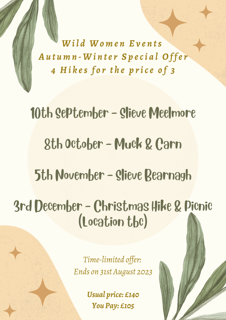 Welcome to the Autumn-Winter series at Wild Women Events… I have in place a special offer of ‘4 hikes for the price of 3’ which is available until the end of August. This costs £105 and will get you one hike a month September-December (see above for the dates).